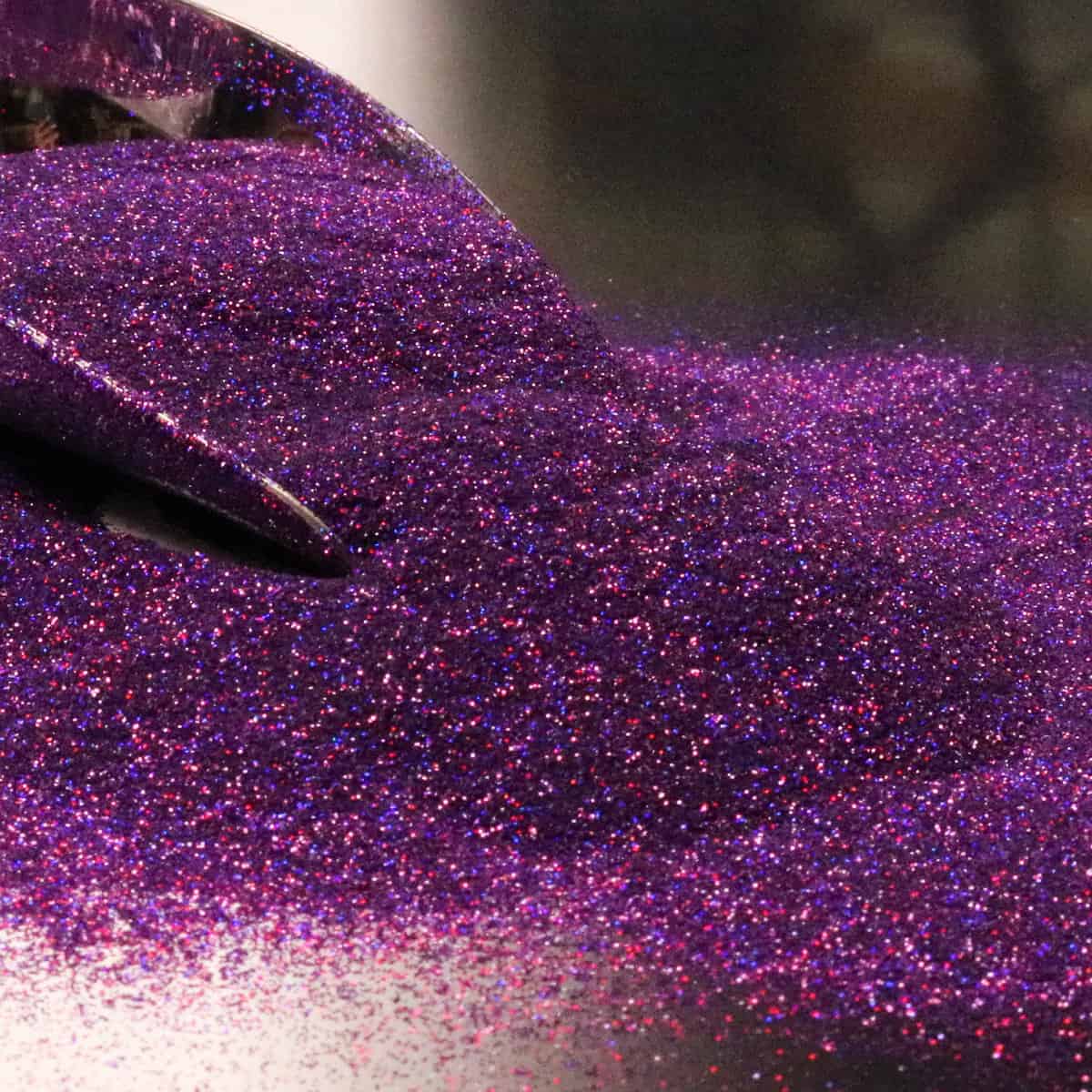 Violaceous is a rich electric purple glitter with subtle flares of reflected colors such as bright blues, hot pinks, violet, and light bright pink. This glitter is extra fine and the very small flakes are consistent in shape and size. Over a light surface this glitter appears more of a red-violet while a dark surface application results in a more dark purple hue. Its reflective properties are consistent over dark and light surfaces. This is a very dynamic glitter displaying a rich purple with plenty of supporting colors of blues, reds, and violets.